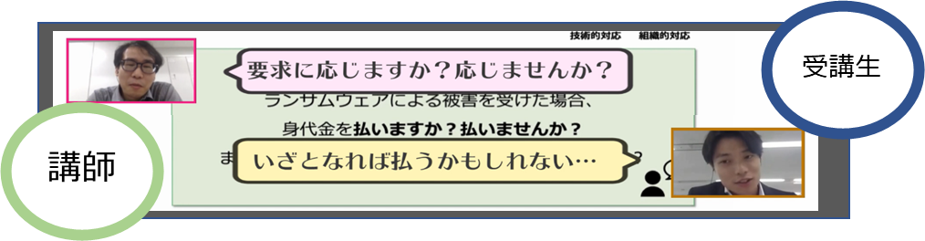 - 講義:各回で取り上げるテーマに関連するITやセキュリティの基礎について講義します。