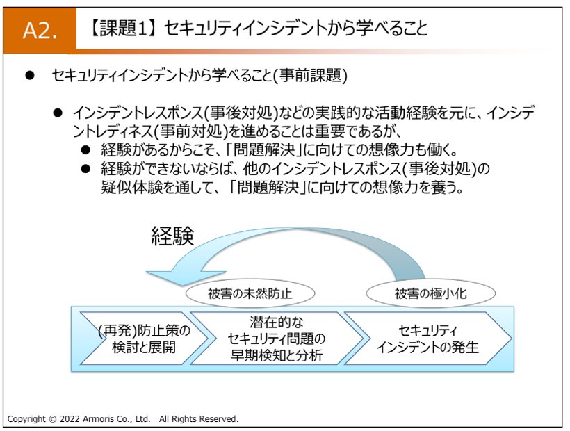 - ケーススタディ&ディスカッション:実際に発生したサイバーインシデントに関するケーススタディを行うとともに、「自分だったらどうするか」「自組織だったらどうなるか」講師と一緒に考えます。