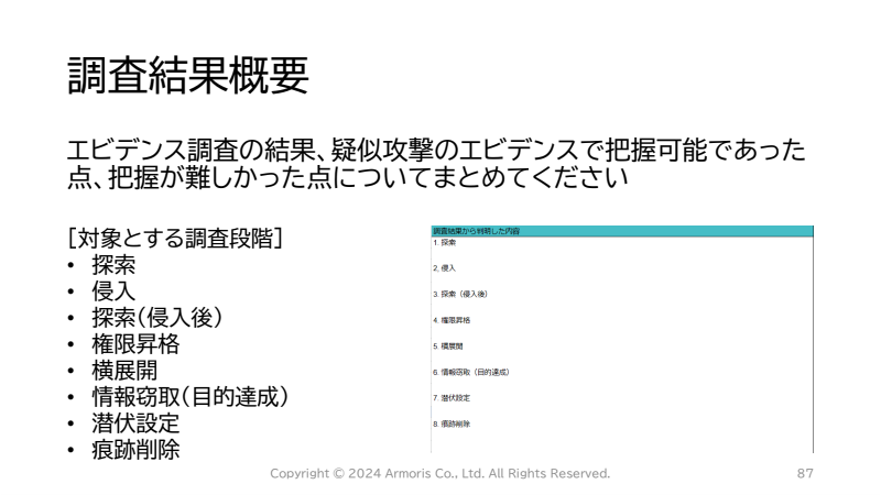サイバー攻撃者の攻撃活動及び攻撃活動により記録されるエビデンス情報及び記録されるログの調査を疑似環境を用いて経験いただき、攻撃側・防御側それぞれの視点で侵入型サイバー攻撃への対応スキルの習得を行っていただきます。具体的には、サイバー攻撃者の攻撃フロー(サイバーキルチェーン)と手段(ツール)及び機能の理解、 (Windows標準コマンド、スキャンツール、C2ツール等)、調査ツールの使用及び調査方法 (レジストリ調査ツール、イベントビューワー等)、各種ログの調査 (FWログ、プロキシログ、イベントログ等)に関するスキルの習得を図ります。